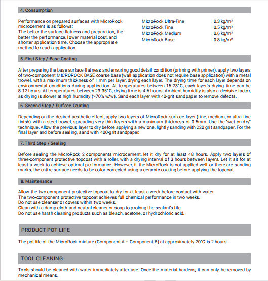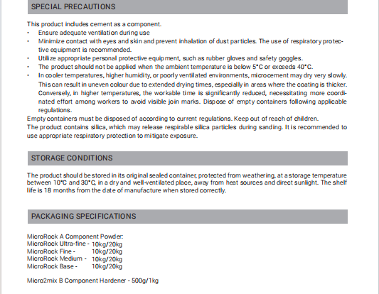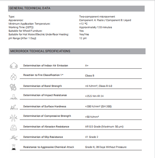 MicroRock technical Microcement technical parameters